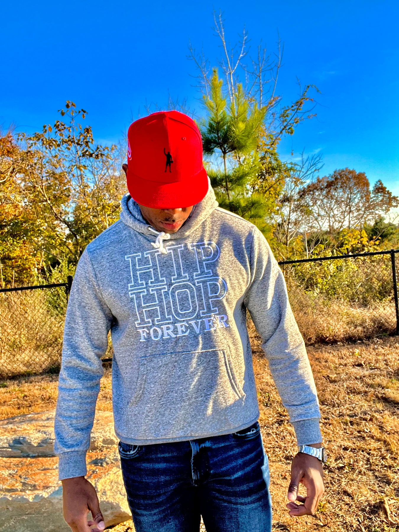 Gray hoodie with white embroidered letters and white strings. Unisex hoodie that fits true to size for men.
